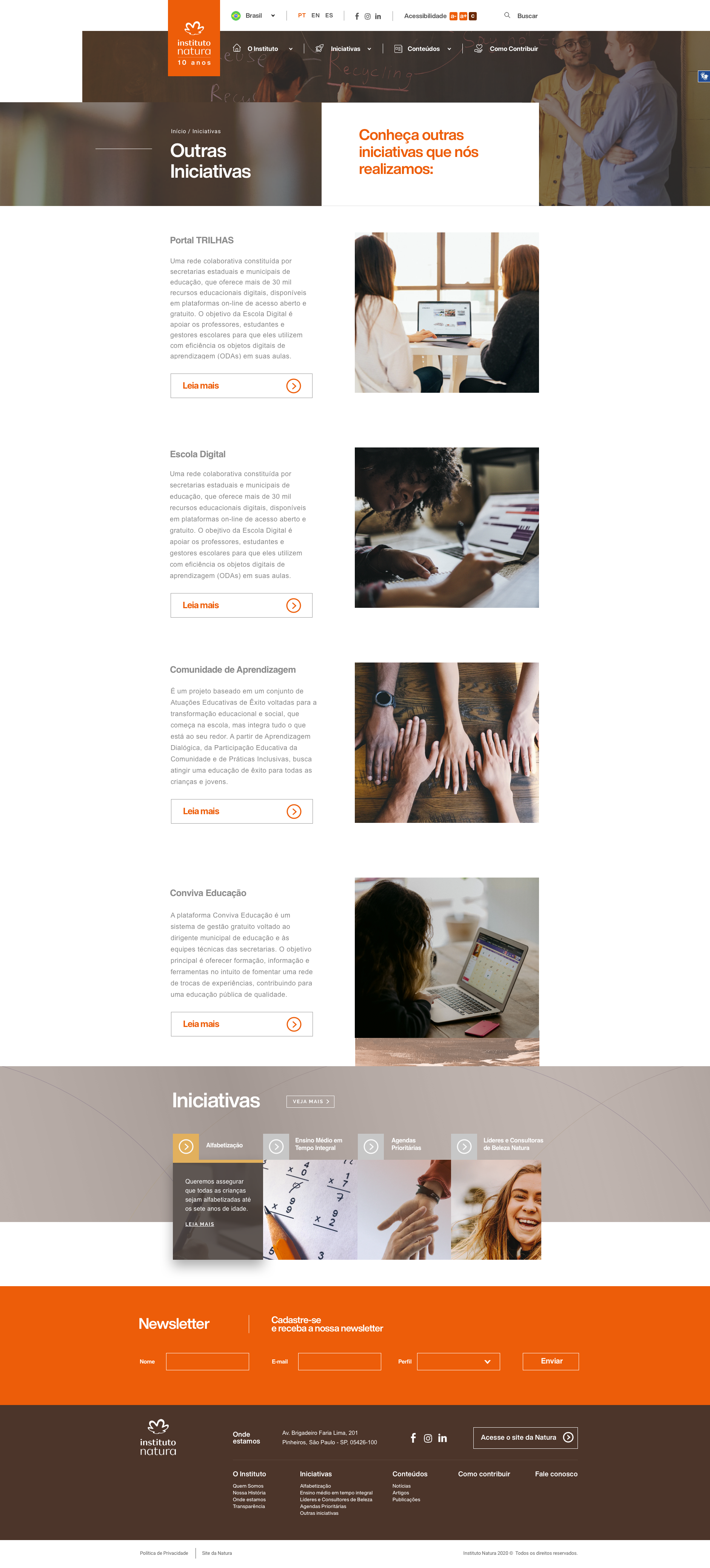 Contém informações sobre os segmentos atuantes do grupo Natura, dentre eles, alfabetização, ensino médio, agendas prioritárias, educação para colaboradores Natura e outras iniciativas.