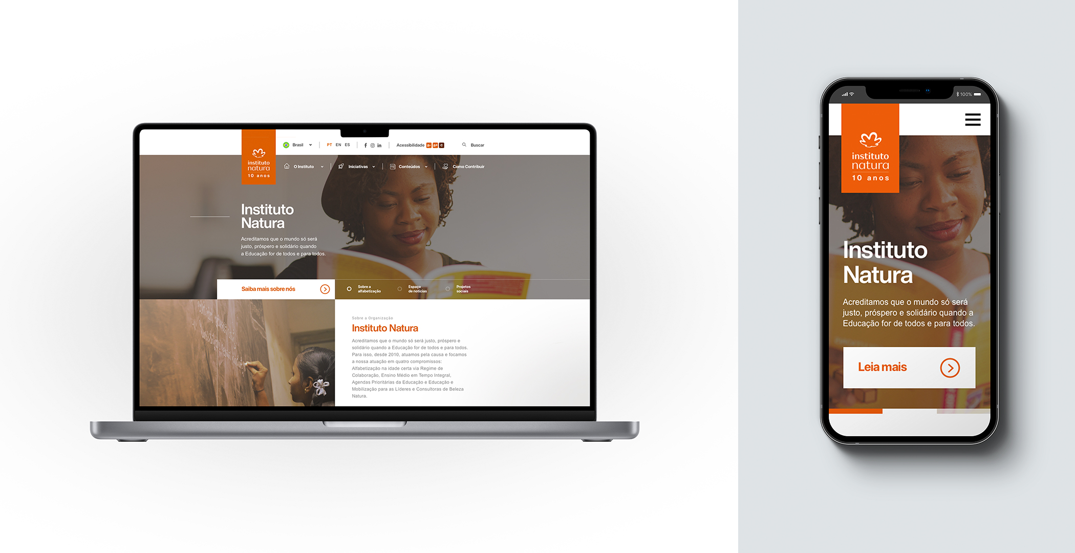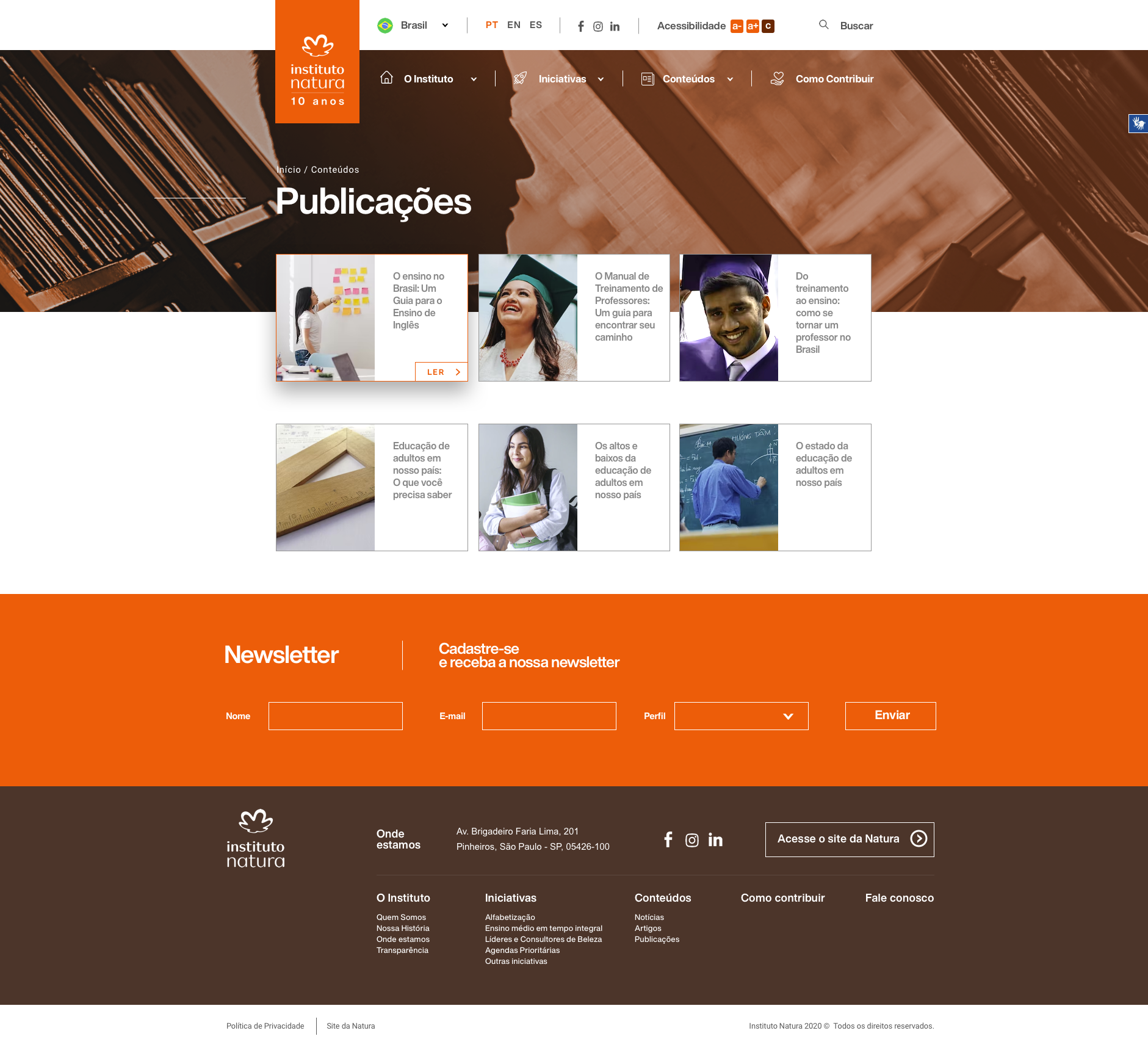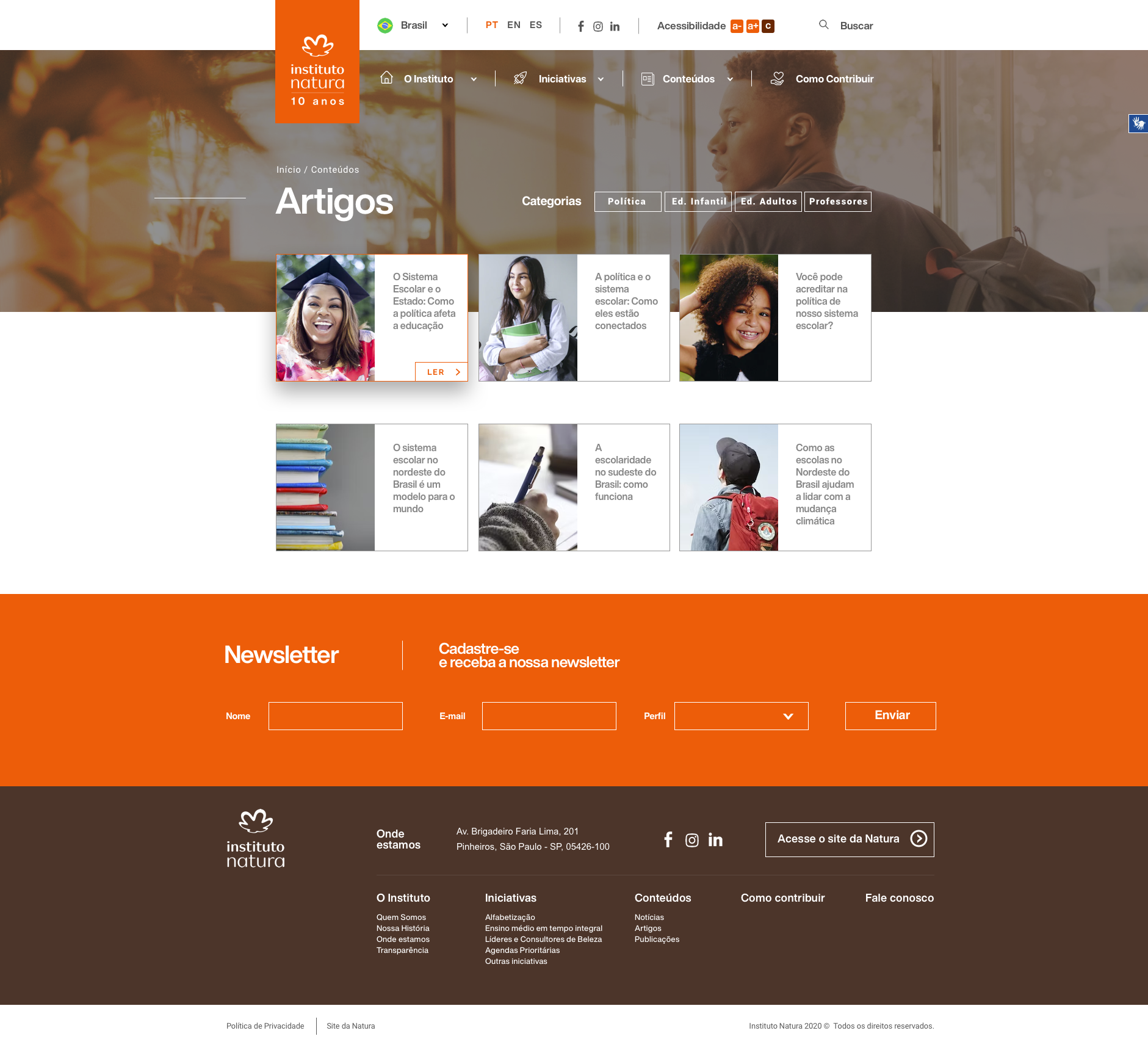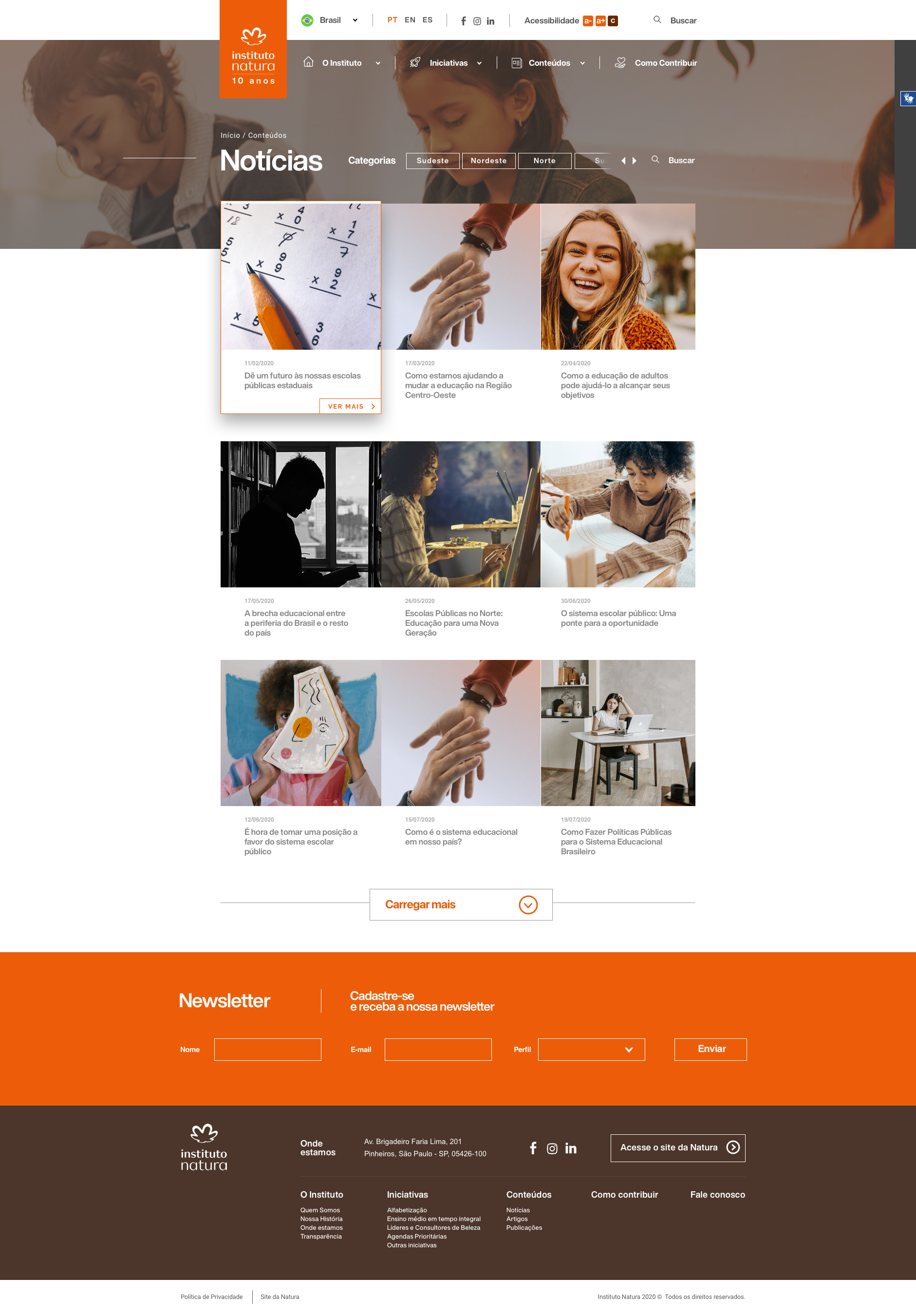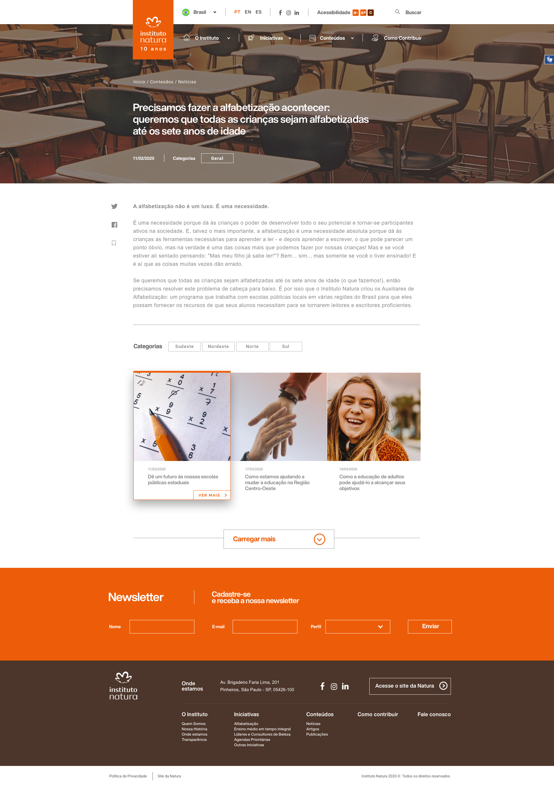 O site do instituto foi diagramado para ser um espaço focado em leitura de notícias e longos textos relacionados à projetos voltados para a educação. A diagramação foi realizada com espaçamentos em branco bem distribuídos que tornam a leitura agradável e com imagens bem relacionadas aos temas.