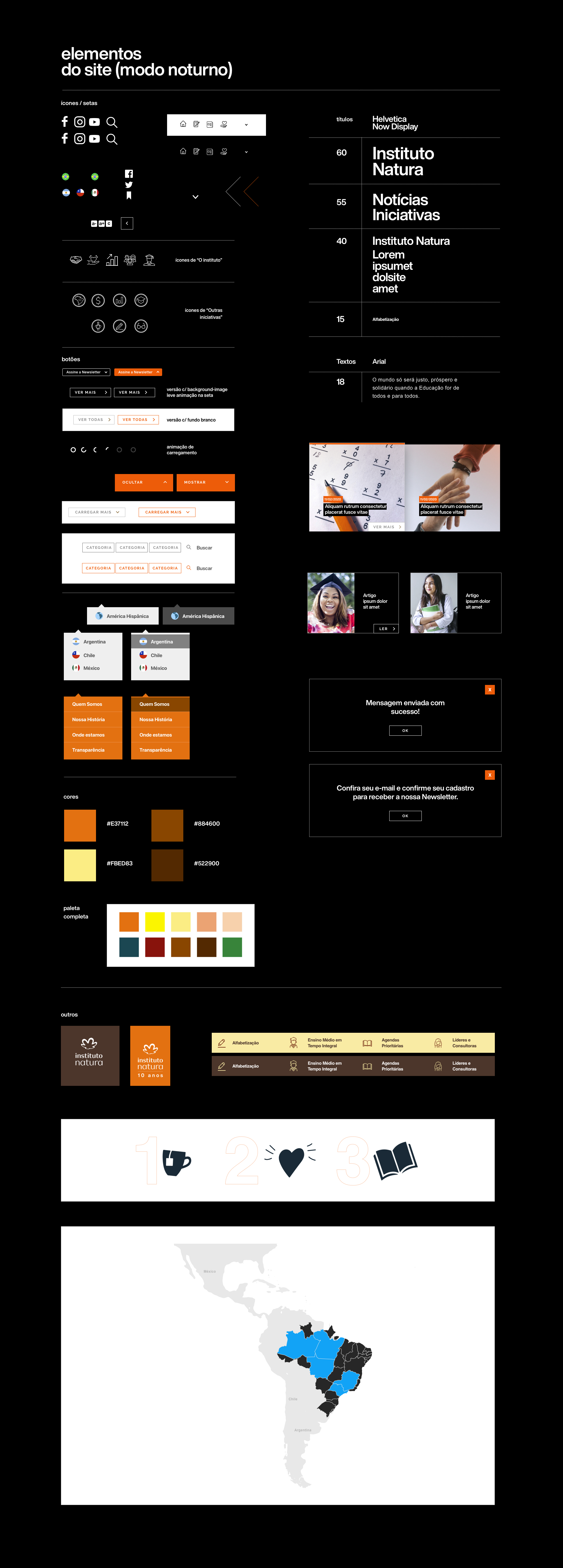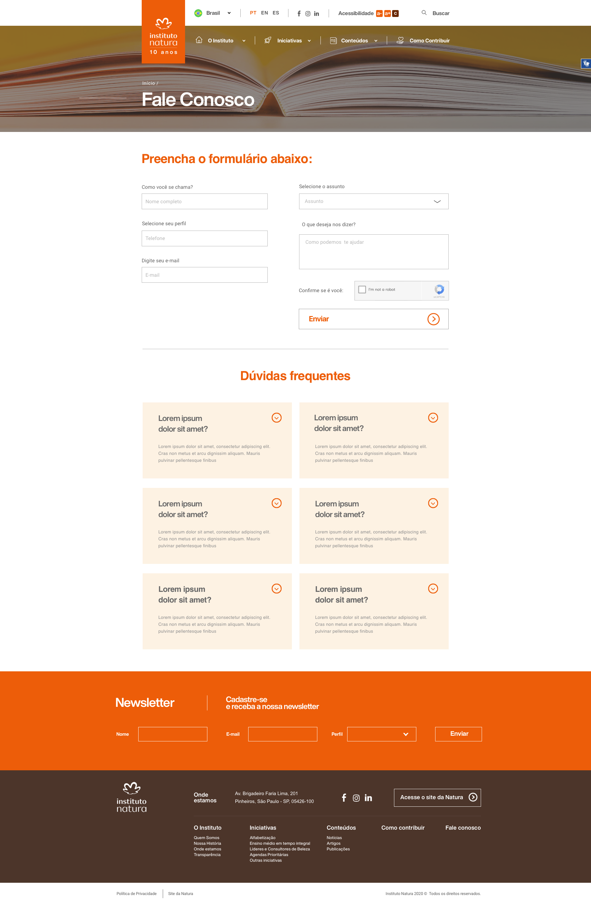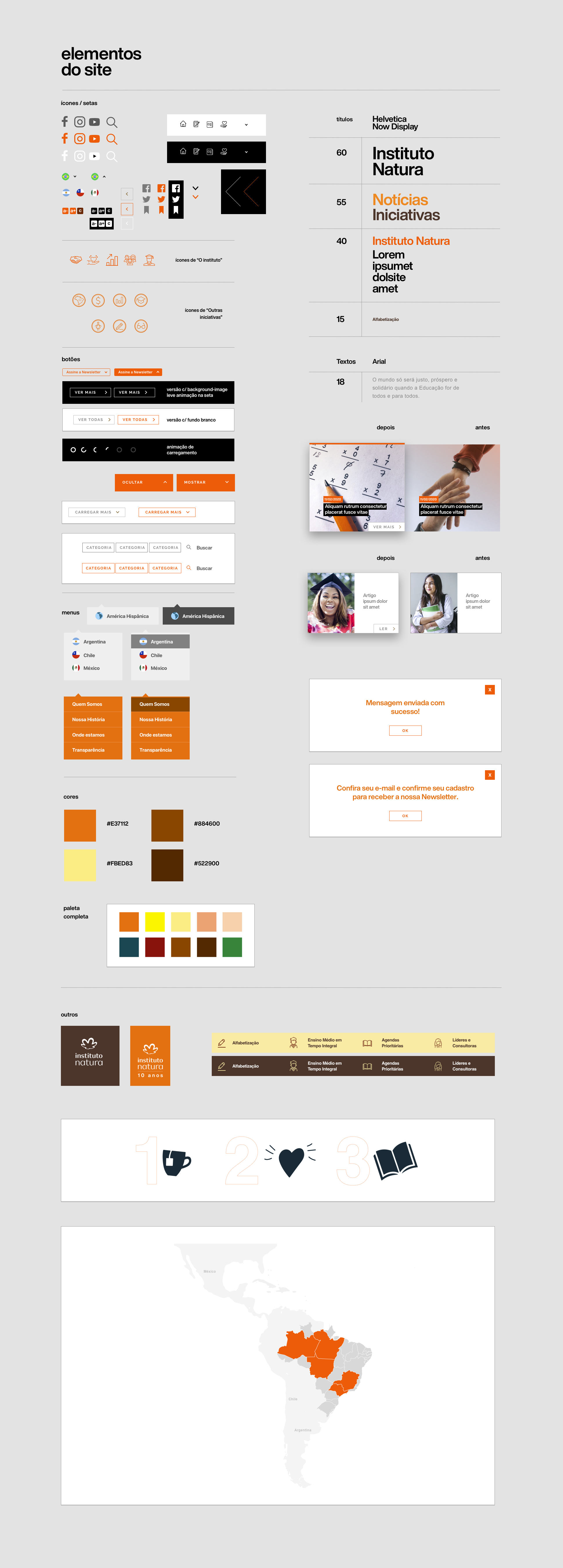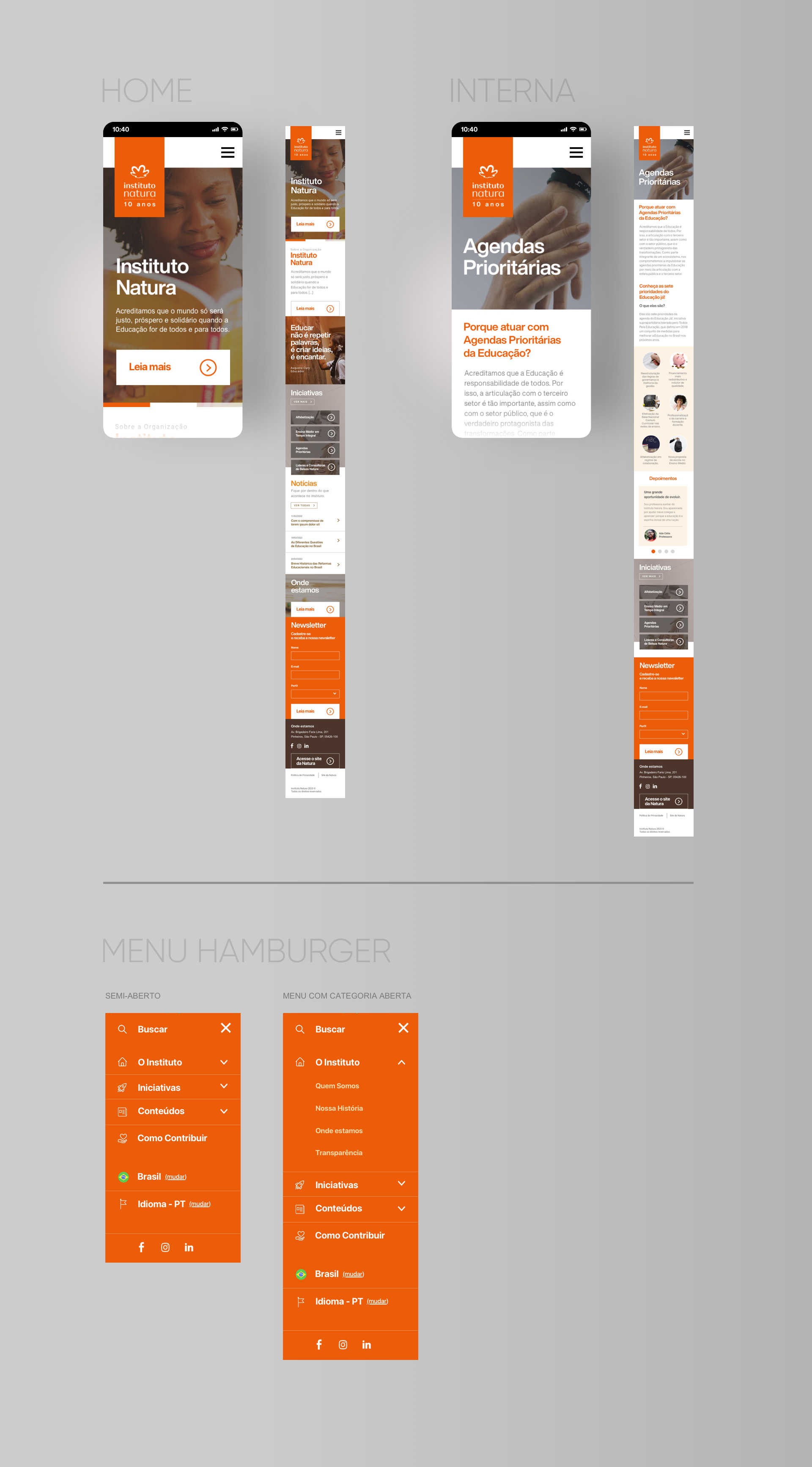 Após estudar o material do Instituto, foi dado início à diagramação dos wireframes, que é um estudo da hierarquia das informações em forma de protótipo. Após a aprovação inicial, por parte dos stakeholders do projeto, foi elaborado um design system enxuto, de forma a facilitar o trabalho de codificação da interface. Após a segunda aprovação, foi feita a diagramação final das interfaces, com aplicação de cores, imagens e textos de exemplo.